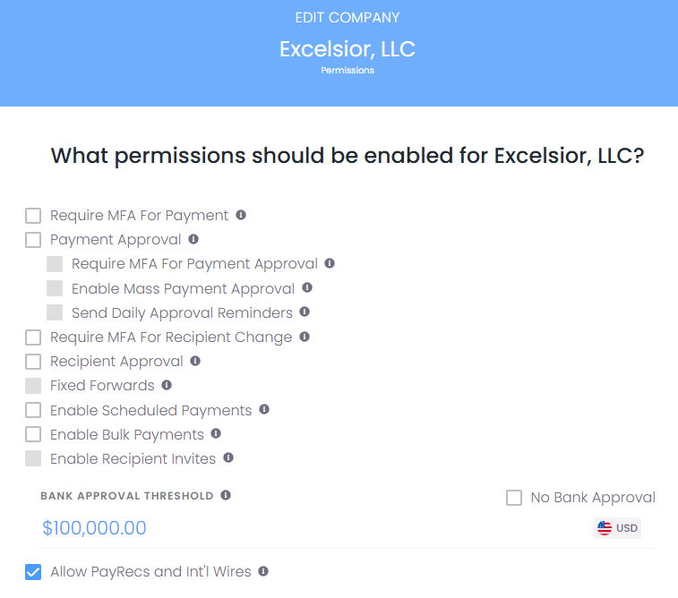 Enable Bulk Payments - Allows the customer to create payments in bulk. Please review the customer's user permissions to grant access to all or specific users.