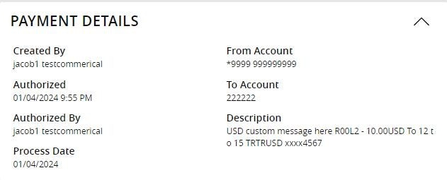 A custom message can be applied to USD and/or Foreign Currency payments, allowing the bank to set unique descriptions for each scenario.
